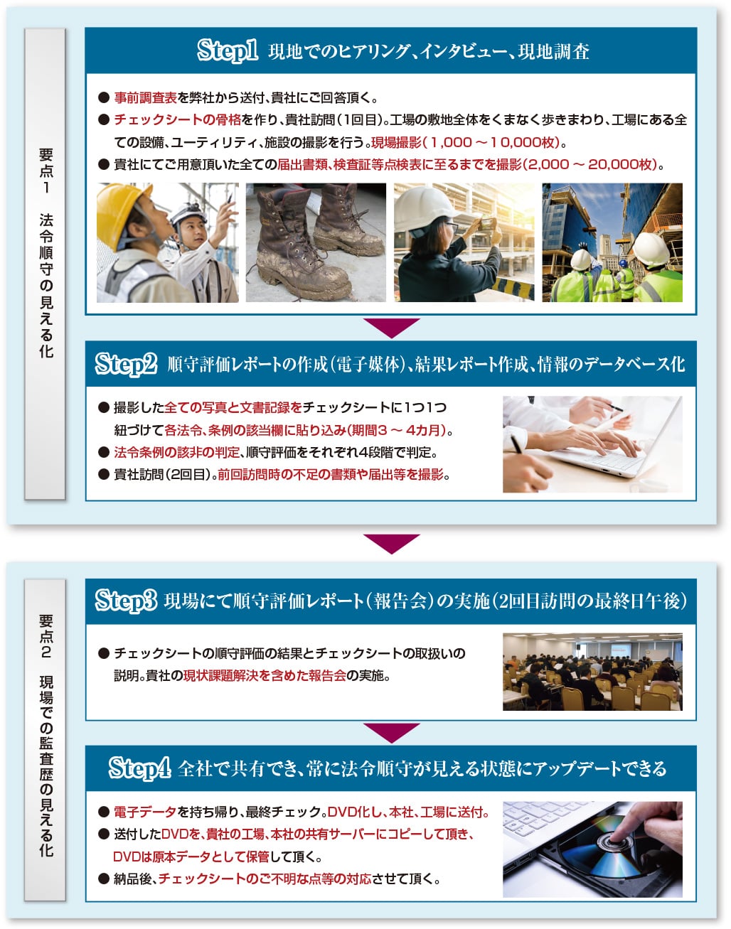 私たちがつくるチェックシートには、どの法令で、誰が、どんな行動を、いつまでにしなければならないかが記されています。