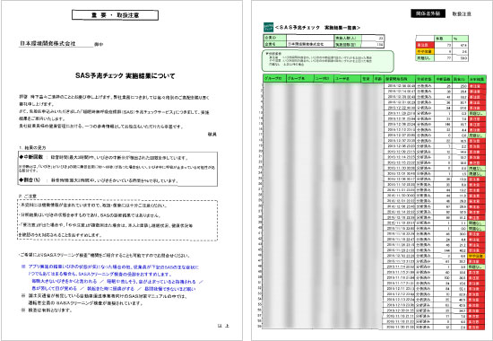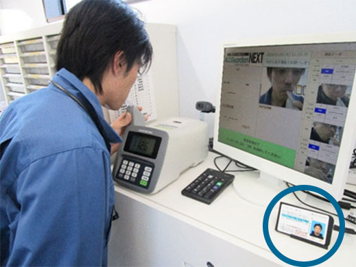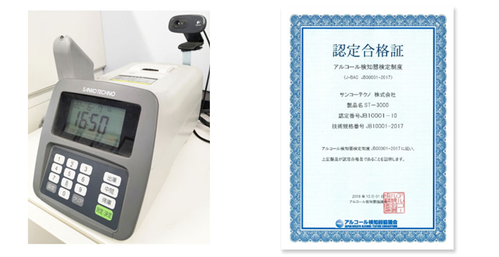 当社では、出庫時・帰庫時にアルコールチェック(サンコーテクノ(株)社製ST-3000使用)を行い、測定を行うと、出庫・帰庫、測定者名、測定値、日時、測定写真が表示され、PCにデータとして保存、管理しております。