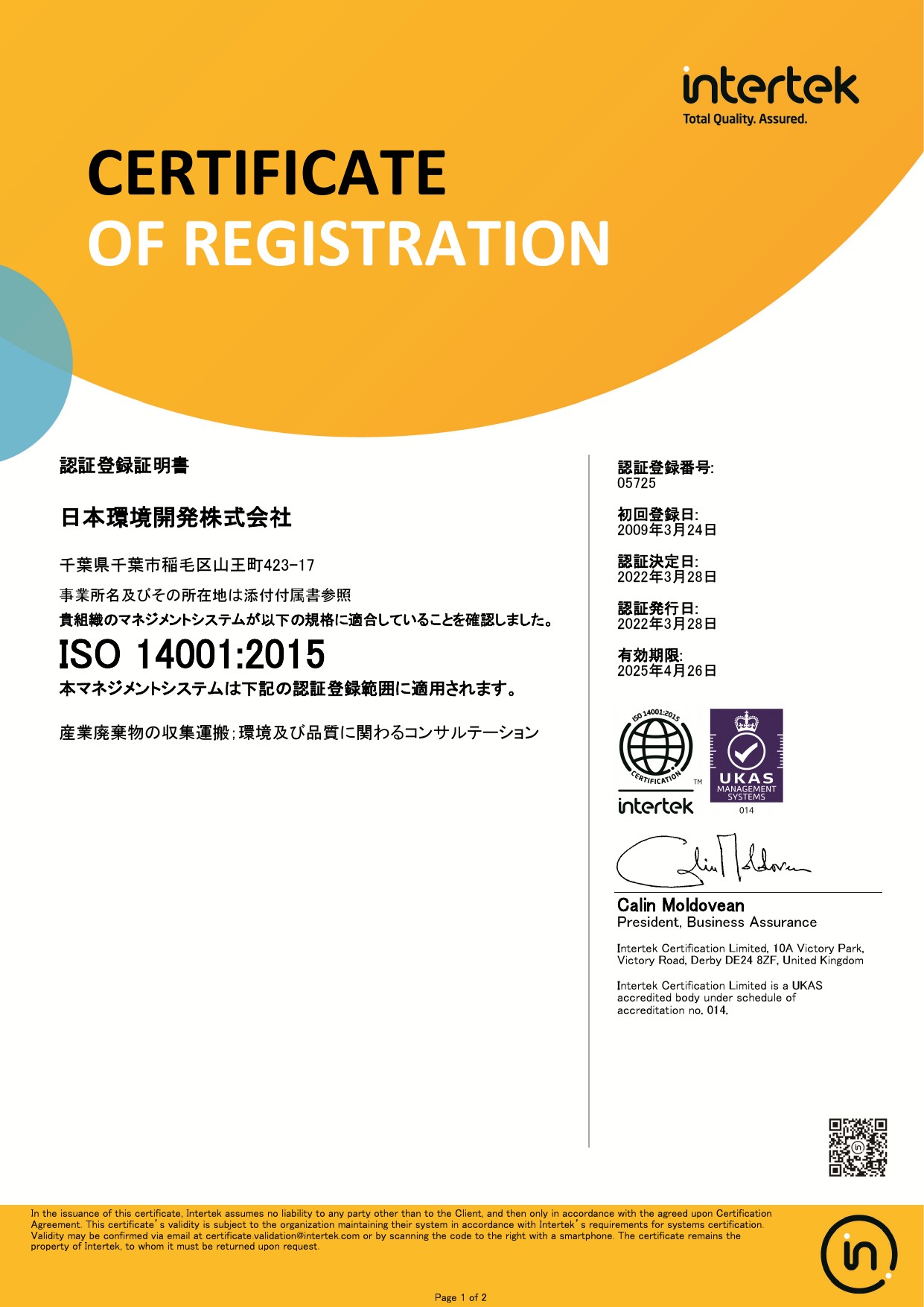 ・ISO14001認定書