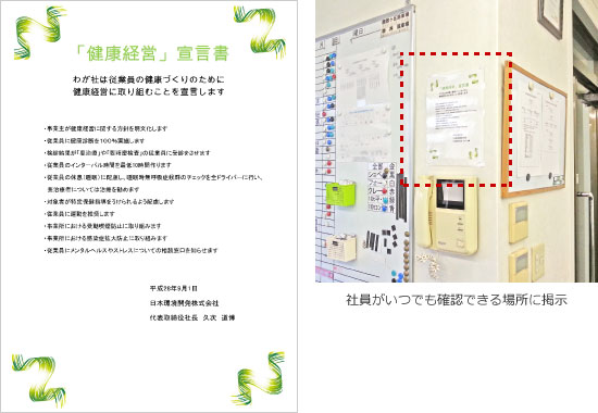 平成28年9月1日「健康経営宣言」を発行 宣言書の作成と掲示 協会健保千葉支部にて「健康な職場づくり宣言」実施 |